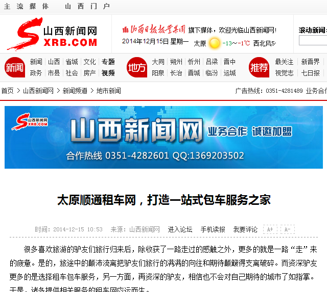 太原順通租車獲得新浪新聞,山西新聞網(wǎng)權(quán)威媒體專訪報(bào)道,特以此鼓勵(lì)公司全體員工再接再厲,在創(chuàng)佳績!